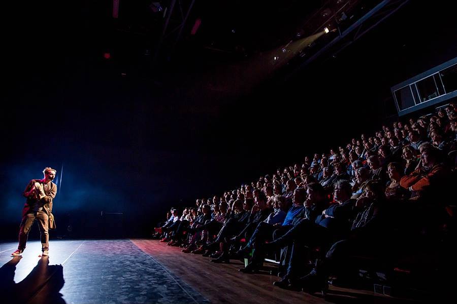 For this one, the flash is on a light stand on the stage behind the subject, pointed towards the crowd.