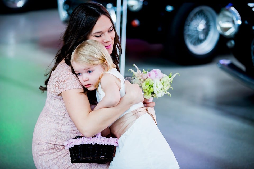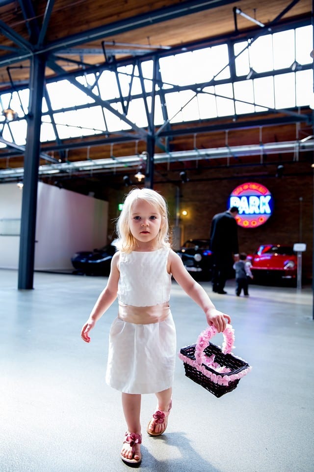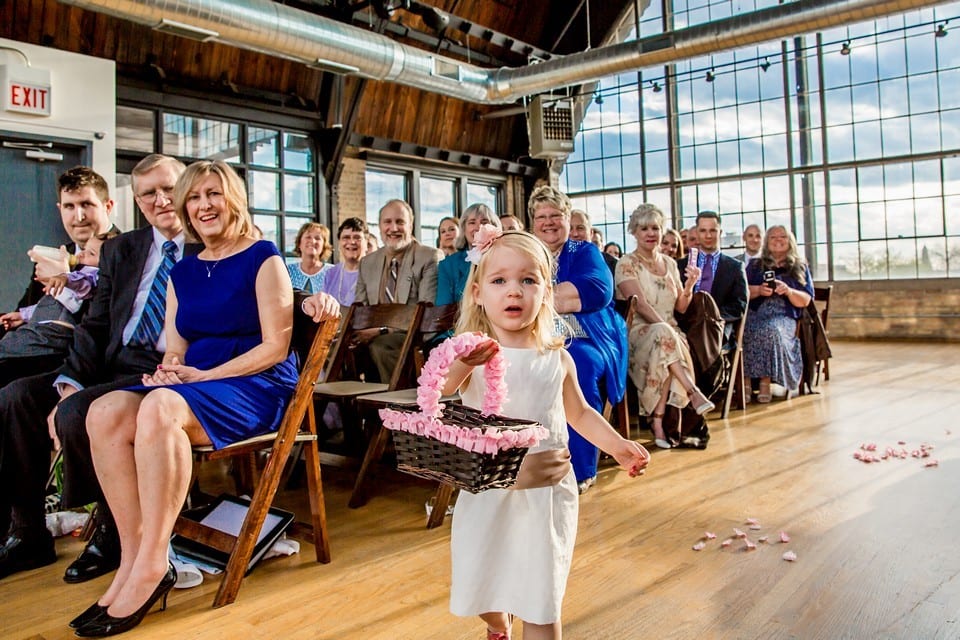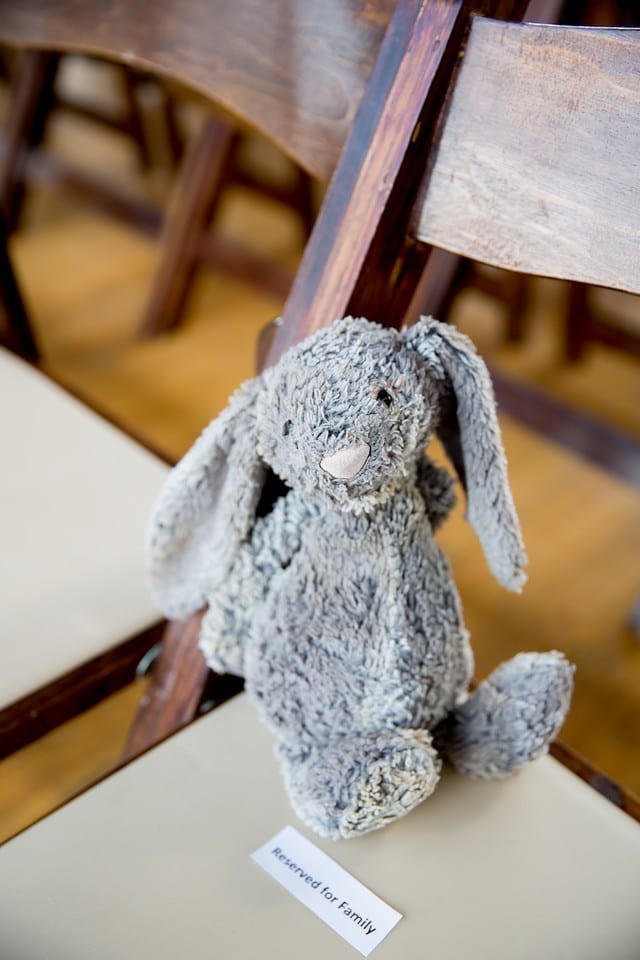 The flower girl Natalie getting half way down the aisle and stopping because she ran out of flowers. She wanted to save two flowers for her stuffed rabbit, Bunny, who was saving her seat (the only way we could get her to walk down the aisle without him). Photographer’s note: Check out the pictures of this below!