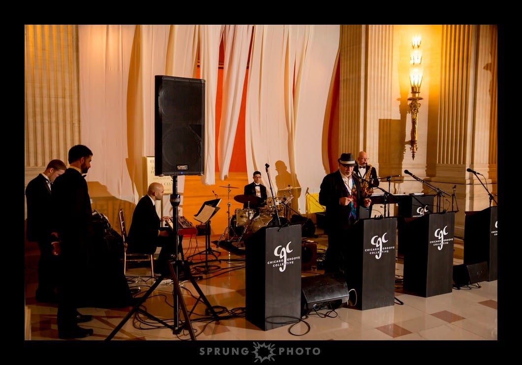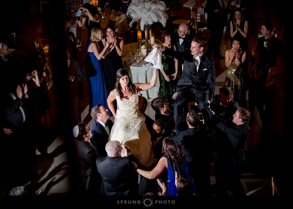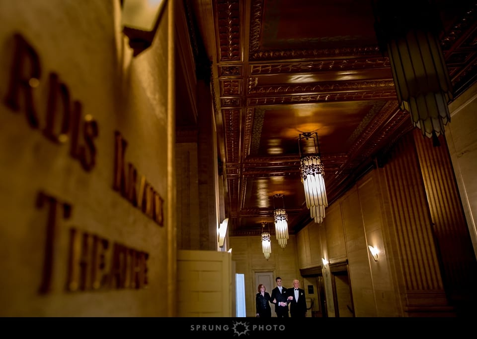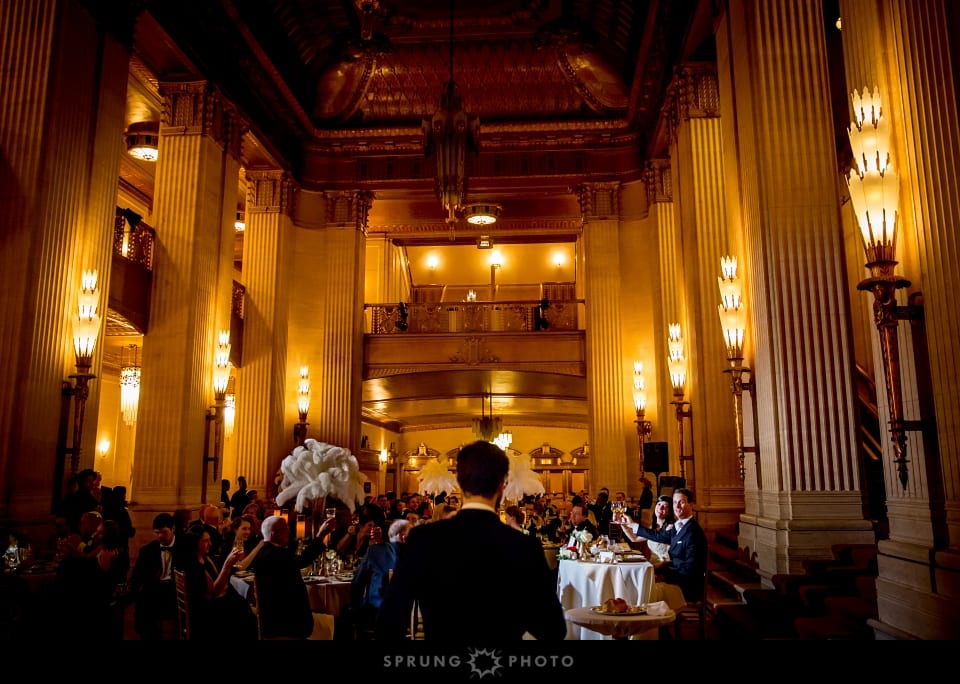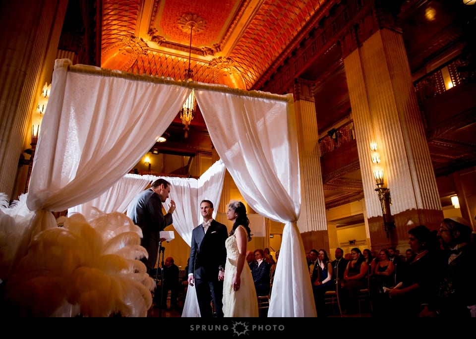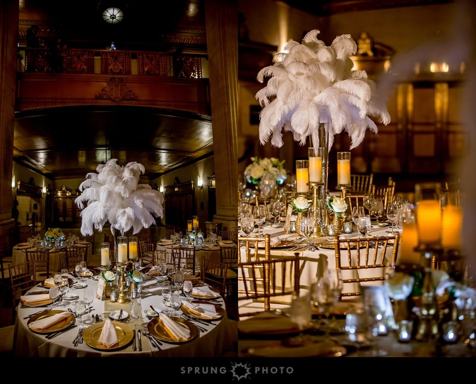Andrew and I were looking for that feeling of “gravitas” when we searched for our venue. We only saw 4, and the last one was perfect for us: Chicago’s Civic Opera House. We were so excited to be in a historic building and a cultural institution, in the center of an urban environment. The Grand Foyer, where we held the ceremony and reception, is gorgeously decorated in art deco style, which we decided to use as our theme. We did not have to do much to the space at all, but we had some gorgeous candle and feather centerpieces, and our reception materials also reflected that jazz age vibe. With everyone in tuxedos and floor length gowns, we hope the ambiance exuded that special, magical, glamour of the 1920s.