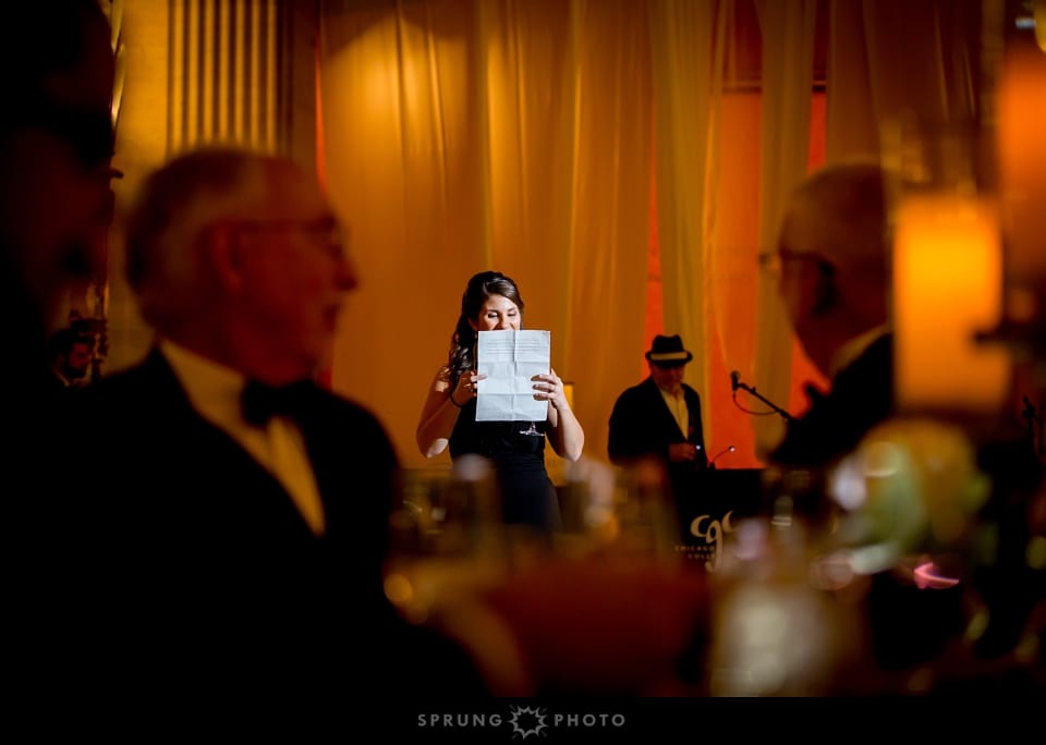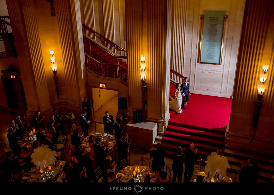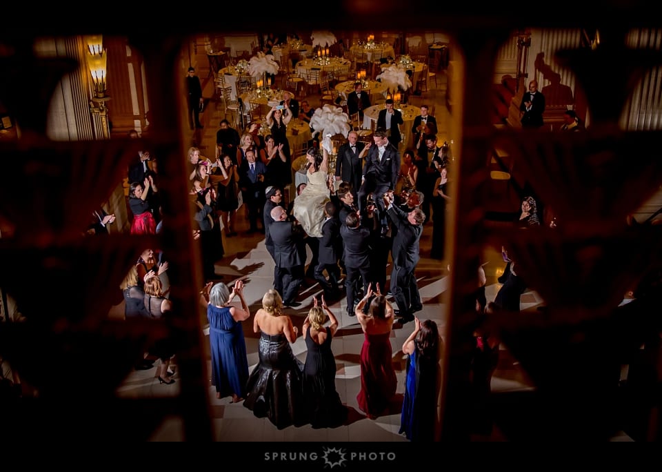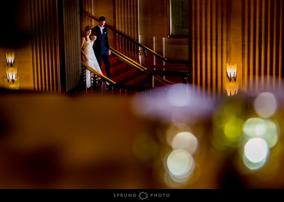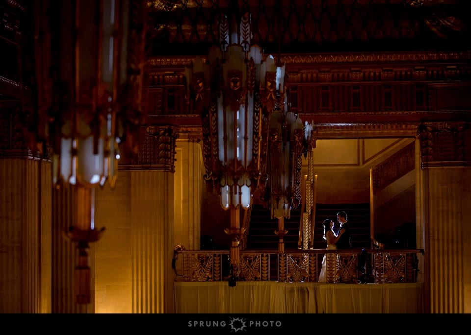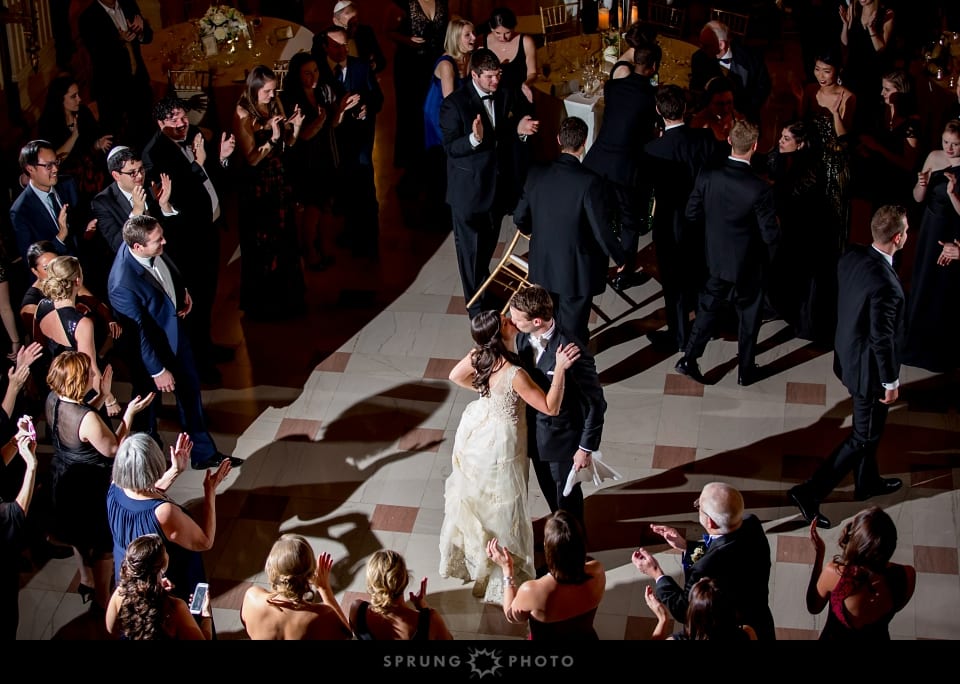Andrew and I were looking for that feeling of “gravitas” when we searched for our venue. We only saw 4, and the last one was perfect for us: Chicago’s Civic Opera House. We were so excited to be in a historic building and a cultural institution, in the center of an urban environment. The Grand Foyer, where we held the ceremony and reception, is gorgeously decorated in art deco style, which we decided to use as our theme. We did not have to do much to the space at all, but we had some gorgeous candle and feather centerpieces, and our reception materials also reflected that jazz age vibe. With everyone in tuxedos and floor length gowns, we hope the ambiance exuded that special, magical, glamour of the 1920s.