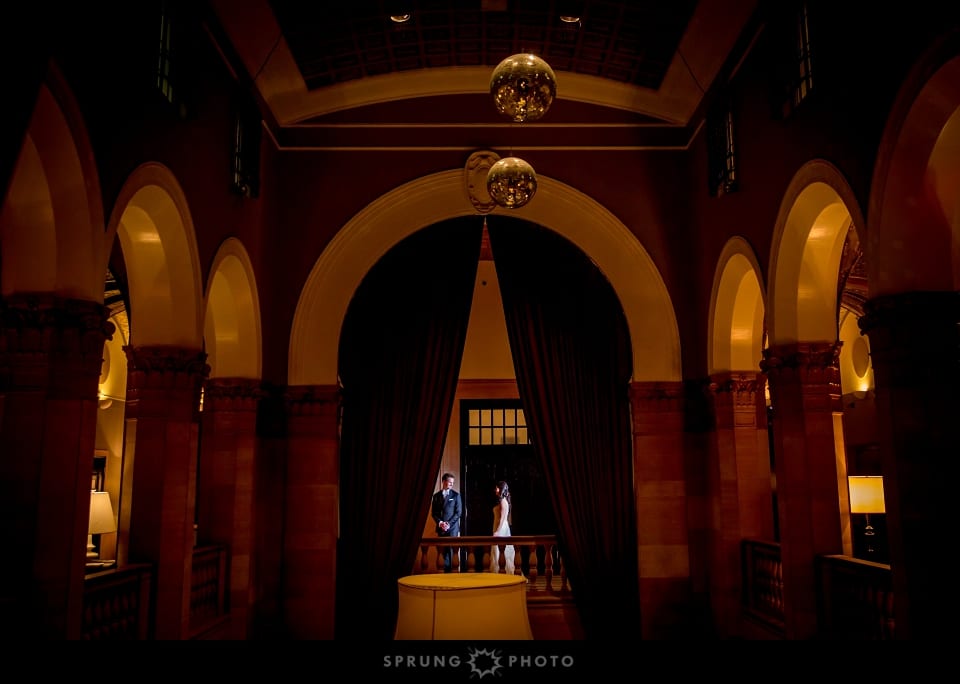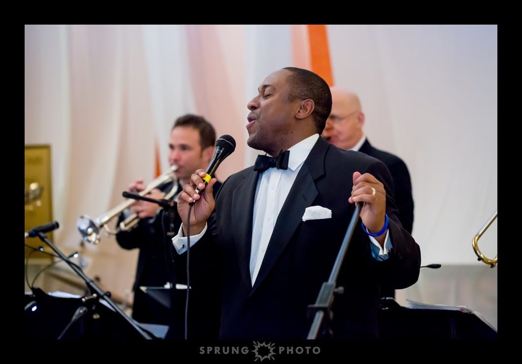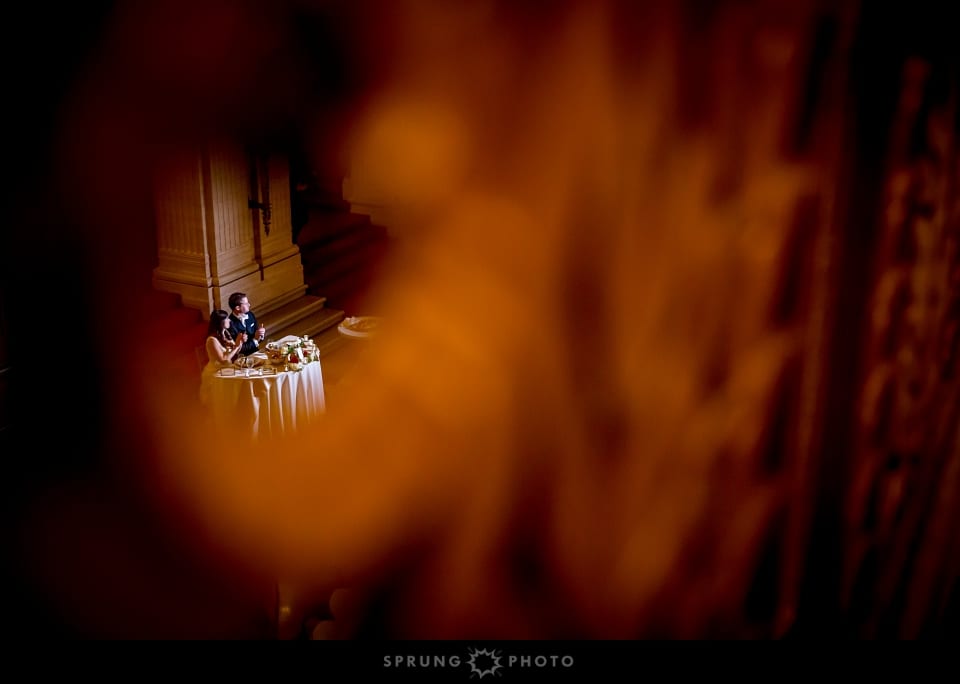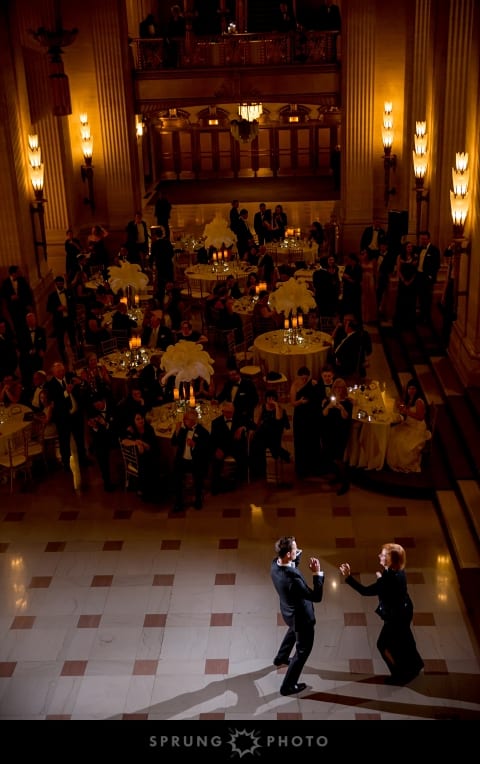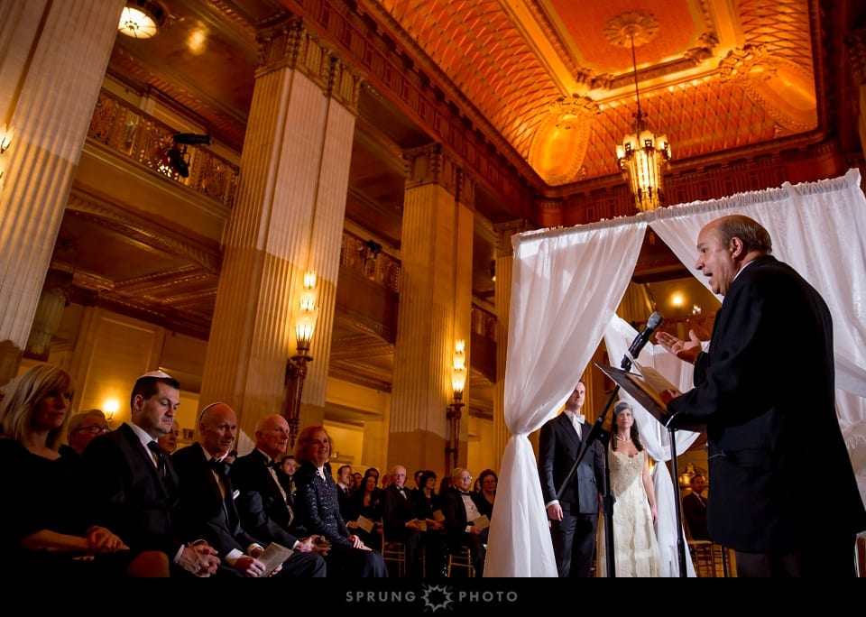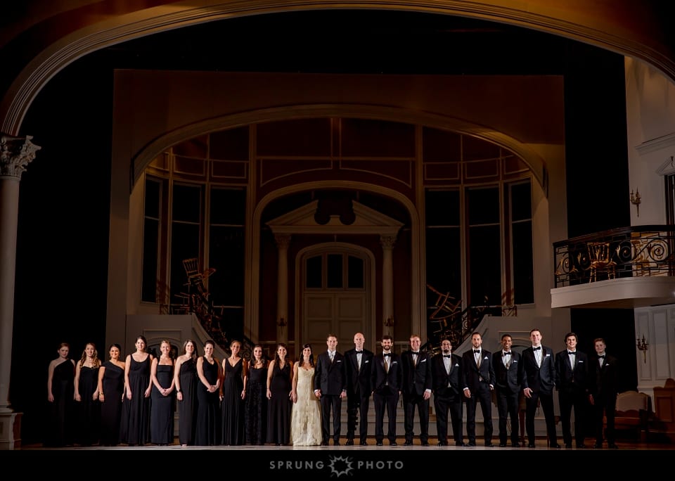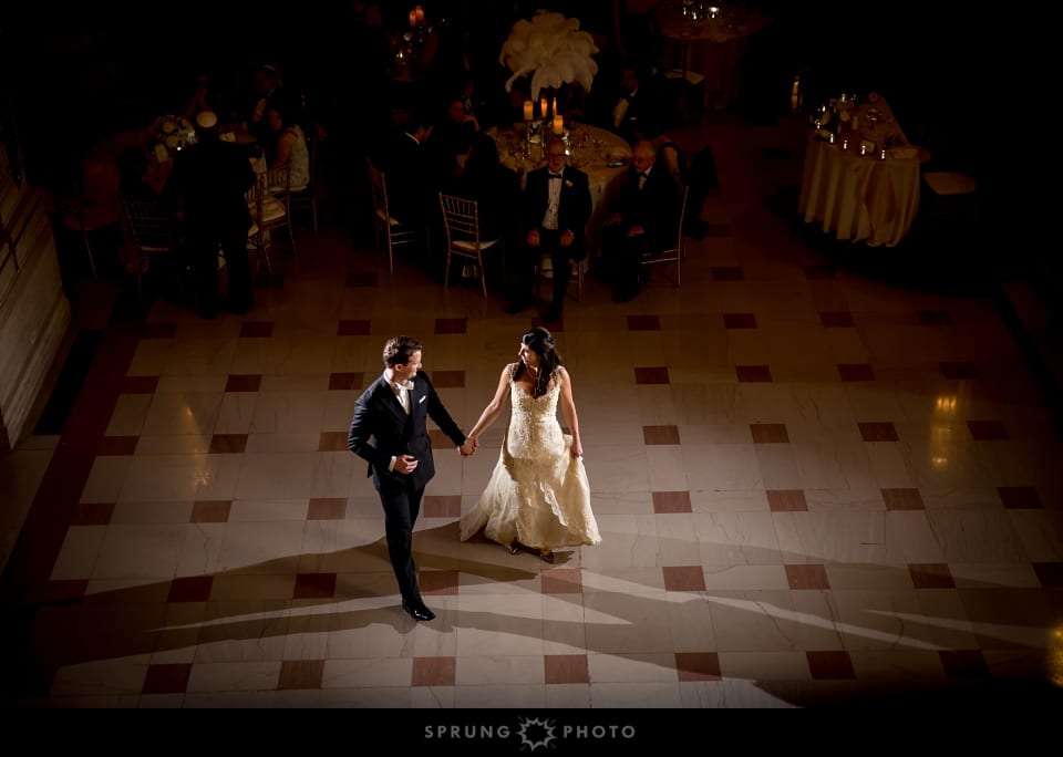 Andrew and I were looking for that feeling of “gravitas” when we searched for our venue. We only saw 4, and the last one was perfect for us: Chicago’s Civic Opera House. We were so excited to be in a historic building and a cultural institution, in the center of an urban environment. The Grand Foyer, where we held the ceremony and reception, is gorgeously decorated in art deco style, which we decided to use as our theme. We did not have to do much to the space at all, but we had some gorgeous candle and feather centerpieces, and our reception materials also reflected that jazz age vibe. With everyone in tuxedos and floor length gowns, we hope the ambiance exuded that special, magical, glamour of the 1920s.
